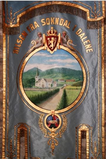 Fanen fra Sokndal er nå på Vesterheim Museum i Decorah, Iowa.