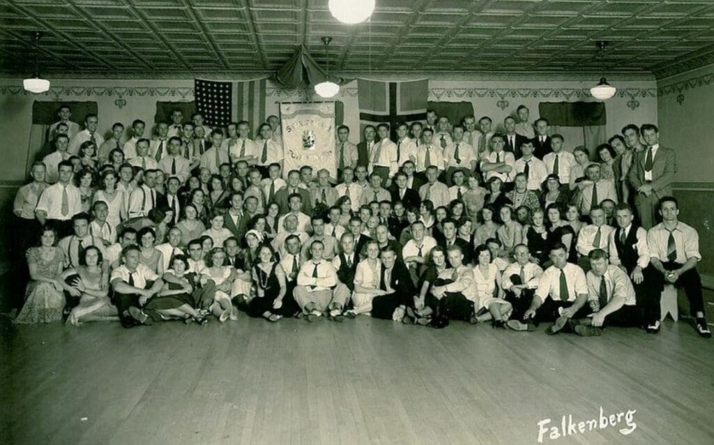 Først i 1934 fikk stavangerfolk sitt eget bylag. Da samlet de seg i Canton, Sør Dakota under sin nye fane ”et rigtig kunstverk, med Domkirken paa den ene side, ekestubben paa den anden, brodert i silke.” Fanestangen var laget av materiale fra et av eiketrærne i Kongsgård. Eier. Stavanger Byarkiv, Arkivenes Hus.