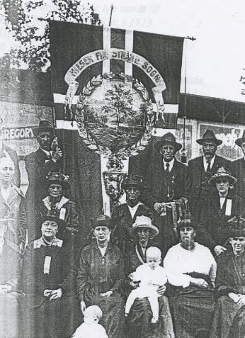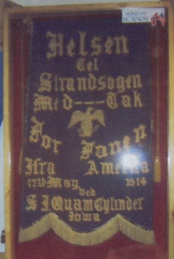 Denne fanen på bildet ble sendt til Strand Bygdelag i USA i 1913. Det er en gave fra Strand sogn til Strandbuer i Amerika. På fanen står det “Hilsen fra Strand Sogn”.